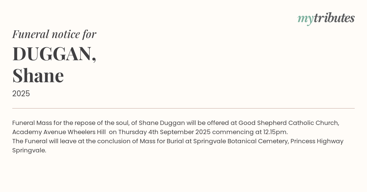 18°CFuneral Mass for the repose of the soul, of Shane Duggan will be offered at Good Shepherd Catholic Church, Academy Avenue Wheelers Hill on Thursday 4th September 2025 commencing at 12.15pm.
