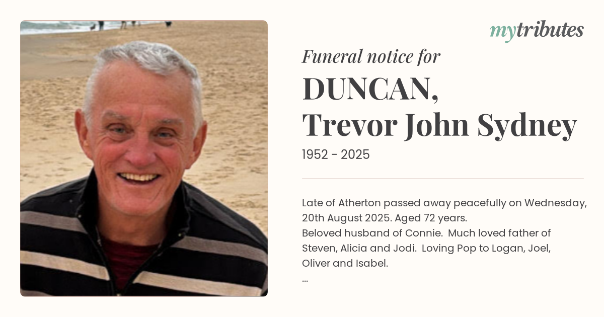 The relatives and friends of Trevor are respectfully invited to attend his funeral service which will be held at St Joseph’s Catholic Church, Mabel Street, Atherton on Friday 29th August 2025. Service commencing at 11.00am. A private cremation will follow.