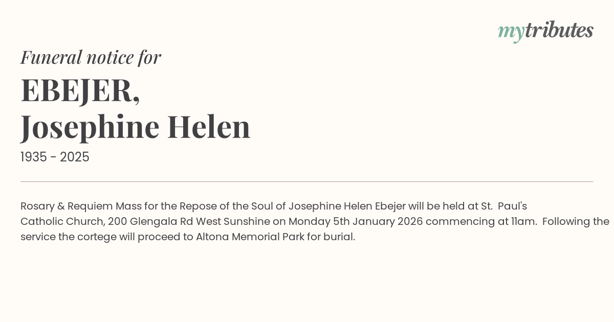 18°CRosary & Requiem Mass for the Repose of the Soul of Josephine Helen Ebejer will be held at St. Paul's Catholic Church, 200 Glengala Rd West Sunshine on Monday 5th January 2026 commencing at 11am. Following the service the cortege will proceed to Altona Memorial Park for burial.