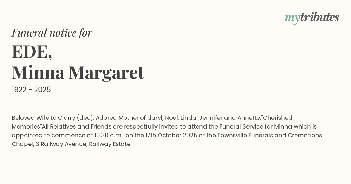 All Relatives and Friends are respectfully invited to attend the Funeral Service for Minna which is appointed to commence at 10.30 a.m. on the 17th October 2025 at the Townsville Funerals and Cremations Chapel, 3 Railway Avenue, Railway Estate