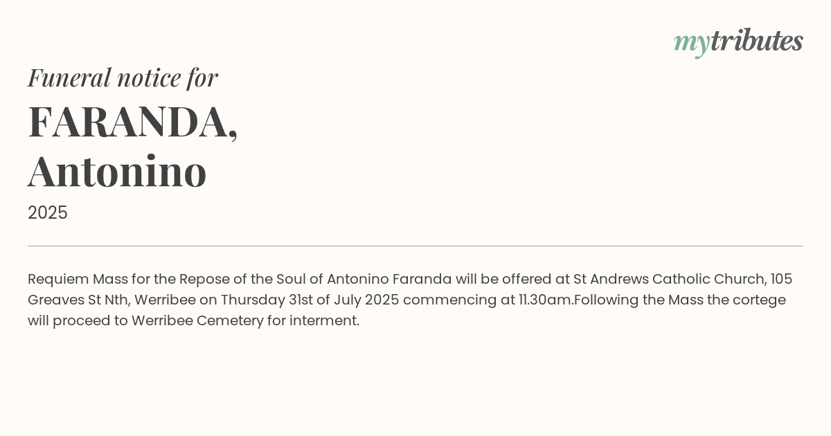 18°CRequiem Mass for the Repose of the Soul of Antonino Faranda will be offered at St Andrews Catholic Church, 105 Greaves St Nth, Werribee on Thursday 31st of July 2025 commencing at 11.30am.