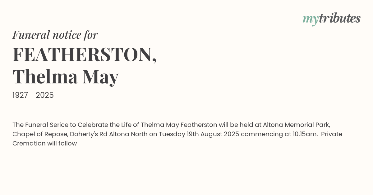 18°CThe Funeral Serice to Celebrate the Life of Thelma May Featherston will be held at Altona Memorial Park, Chapel of Repose, Doherty's Rd Altona North on Tuesday 19th August 2025 commencing at 10.15am. Private Cremation will follow
