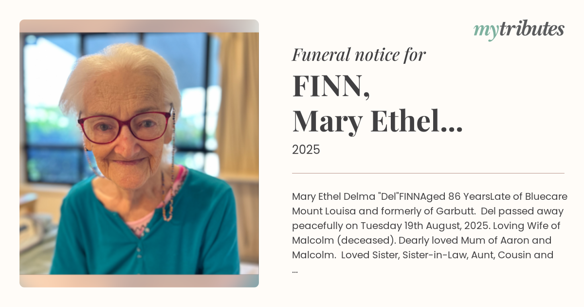 Late of Bluecare Mount Louisa and formerly of Garbutt. Del passed away peacefully on Tuesday 19th August, 2025. Loving Wife of Malcolm (deceased). Dearly loved Mum of Aaron and Malcolm. Loved Sister, Sister-in-Law, Aunt, Cousin and Friend to many.