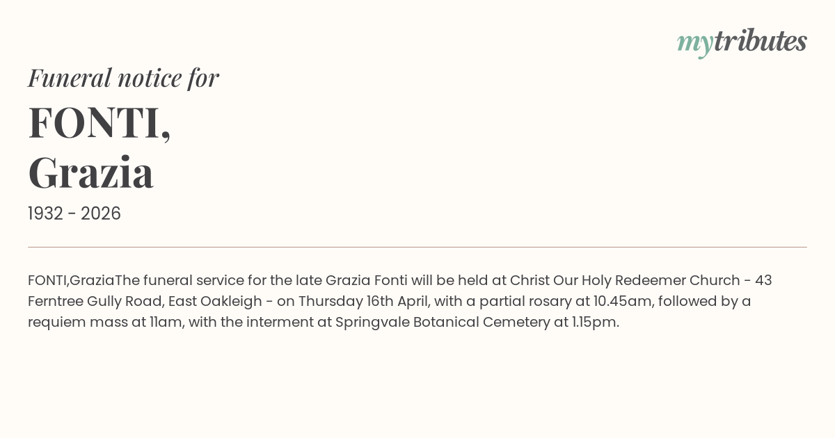 The funeral service for the late Grazia Fonti will be held at Christ Our Holy Redeemer Church