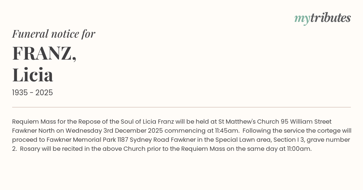 18°CRequiem Mass for the Repose of the Soul of Licia Franz will be held at St Matthew's Church 95 William Street Fawkner North on Wednesday 3rd December 2025 commencing at 11:45am. Following the service the cortege will proceed to Fawkner Memorial Park 1187 Sydney Road Fawkner in the Special Lawn area, Section I 3, grave number 2. Rosary will be recited in the above Church prior to the Requiem Mass on the same day at 11:00am.