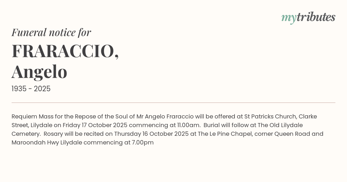 18°CRequiem Mass for the Repose of the Soul of Mr Angelo Fraraccio will be offered at St Patrick’s Church, Clarke Street, Lilydale on Friday 17 October 2025 commencing at 11.00am. Burial will follow at The Old Lilydale Cemetery. Rosary will be recited on Thursday 16 October 2025 at The Le Pine Chapel, corner Queen Road and Maroondah Hwy Lilydale commencing at 7.00pm