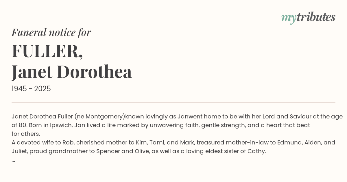 18°CJanet Dorothea Fuller (née Montgomery)—known lovingly as Jan—went home to be with her Lord and Saviour at the age of 80. Born in Ipswich, Jan lived a life marked by unwavering faith, gentle strength, and a heart that beat for others.