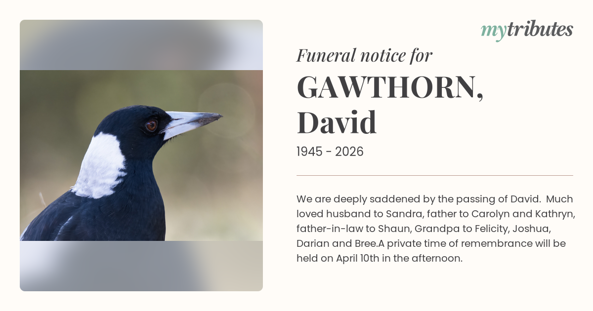 18°CWe are deeply saddened by the passing of David. Much loved husband to Sandra, father to Carolyn and Kathryn, father-in-law to Shaun, Grandpa to Felicity, Joshua, Darian and Bree.