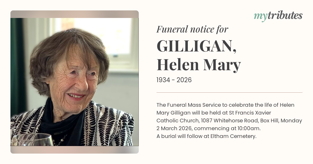 18°CThe Funeral Mass Service to celebrate the life of Helen Mary Gilligan will be held at St Francis Xavier Catholic Church, 1087 Whitehorse Road, Box Hill, Monday 2 March 2026, commencing at 10:00am.