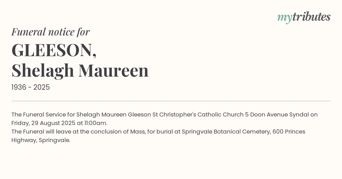18°CThe Funeral Service for Shelagh Maureen Gleeson St Christopher's Catholic Church 5 Doon Avenue Syndal on Friday, 29 August 2025 at 11:00am.