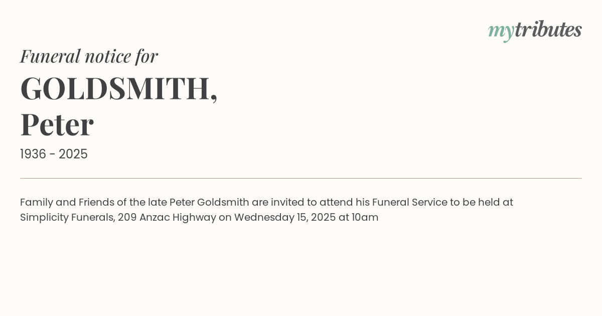 18°CFamily and Friends of the late Peter Goldsmith are invited to attend his Funeral Service to be held at Simplicity Funerals, 209 Anzac Highway on Wednesday 15, 2025 at 10am