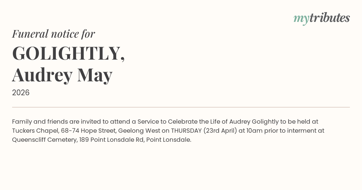 18°CFamily and friends are invited to attend a Service to Celebrate the Life of Audrey Golightly to be held at Tuckers Chapel, 68-74 Hope Street, Geelong West on THURSDAY (23rd April) at 10am prior to interment at Queenscliff Cemetery, 189 Point Lonsdale Rd, Point Lonsdale.