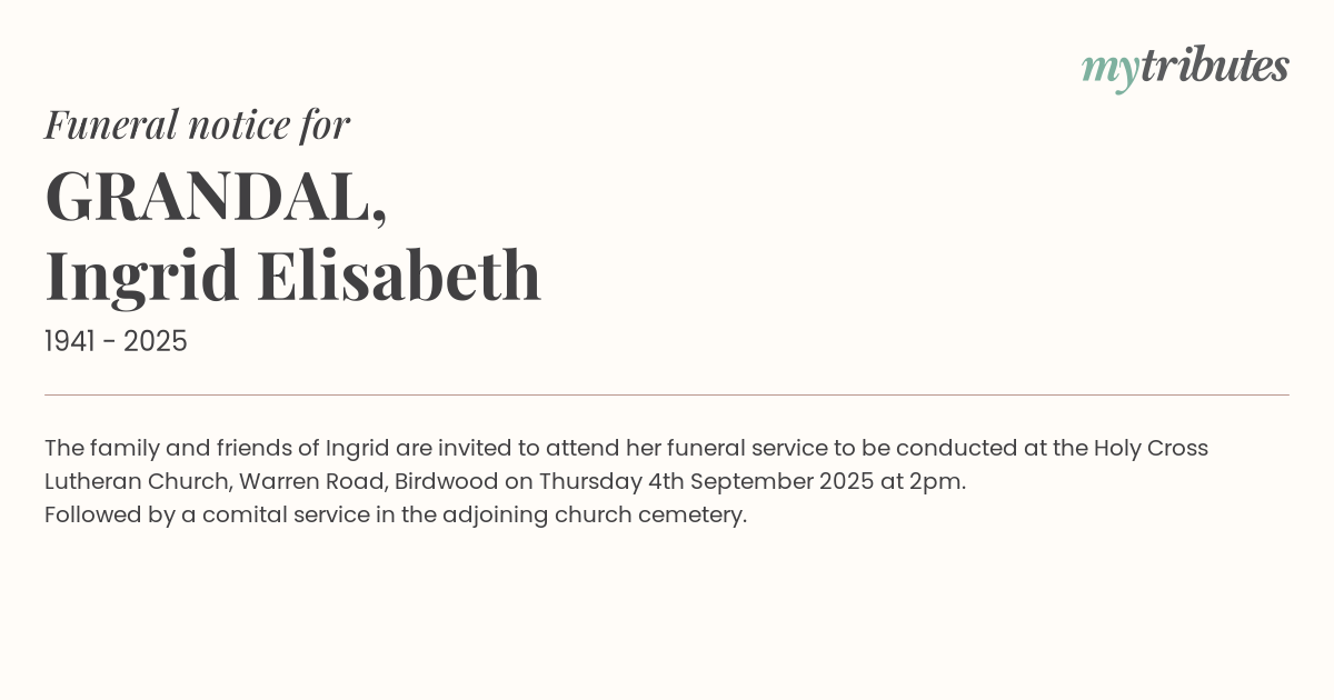 18°CThe family and friends of Ingrid are invited to attend her funeral service to be conducted at the Holy Cross Lutheran Church, Warren Road, Birdwood on Thursday 4th September 2025 at 2pm.