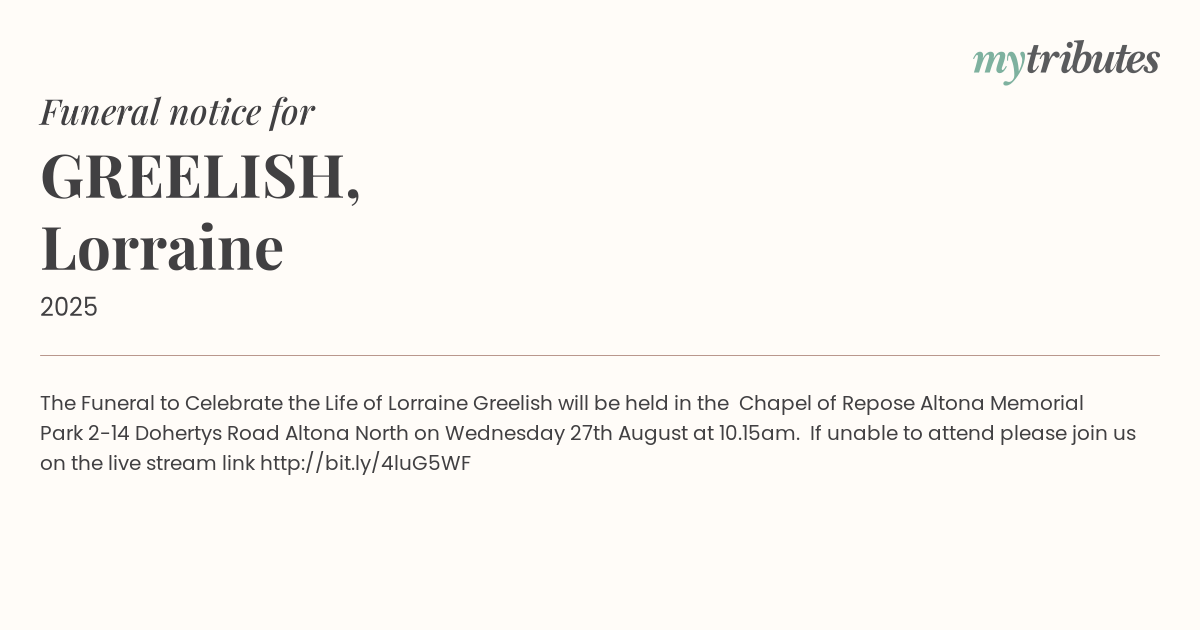 18°CThe Funeral to Celebrate the Life of Lorraine Greelish will be held in the Chapel of Repose Altona Memorial Park 2-14 Dohertys Road Altona North on Wednesday 27th August at 10.15am. If unable to attend please join us on the live stream link http://bit.ly/4luG5WF