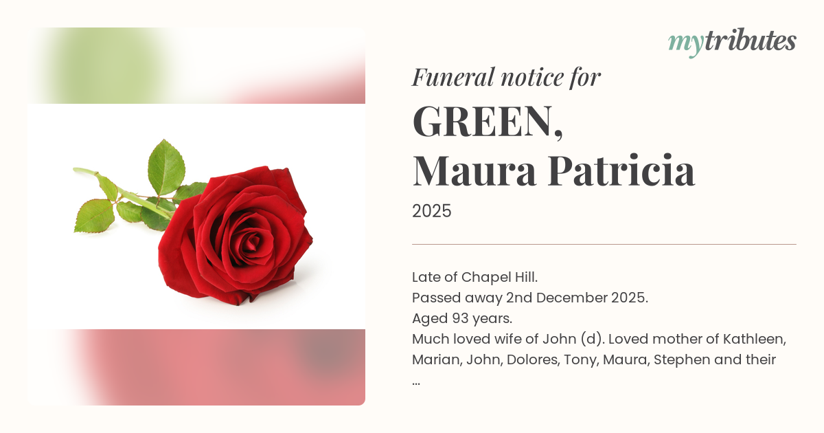 18°CLate of Chapel Hill. Passed away 2nd December 2025. Aged 93 years. Much loved wife of John (d). Loved mother of Kathleen, Marian, John, Dolores, Tony, Maura, Stephen and their families. A celebration of Maura's life will be held at Centenary Memorial Gardens Chapel, 353 Wacol Station Road, Sumner, on Thursday 11th December, at 12 p.m.