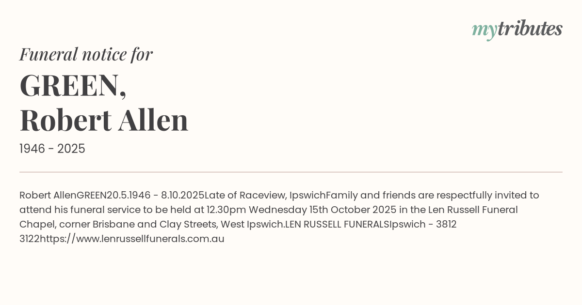 Family and friends are respectfully invited to attend his funeral service to be held at 12.30pm Wednesday 15th October 2025 in the Len Russell Funeral Chapel, corner Brisbane and Clay Streets, West Ipswich.