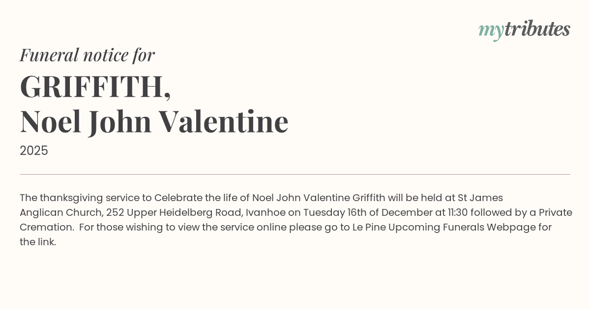 18°CThe thanksgiving service to Celebrate the life of Noel John Valentine Griffith will be held at St James Anglican Church, 252 Upper Heidelberg Road, Ivanhoe on Tuesday 16th of December at 11:30 followed by a Private Cremation. For those wishing to view the service online please go to Le Pine Upcoming Funerals Webpage for the link.