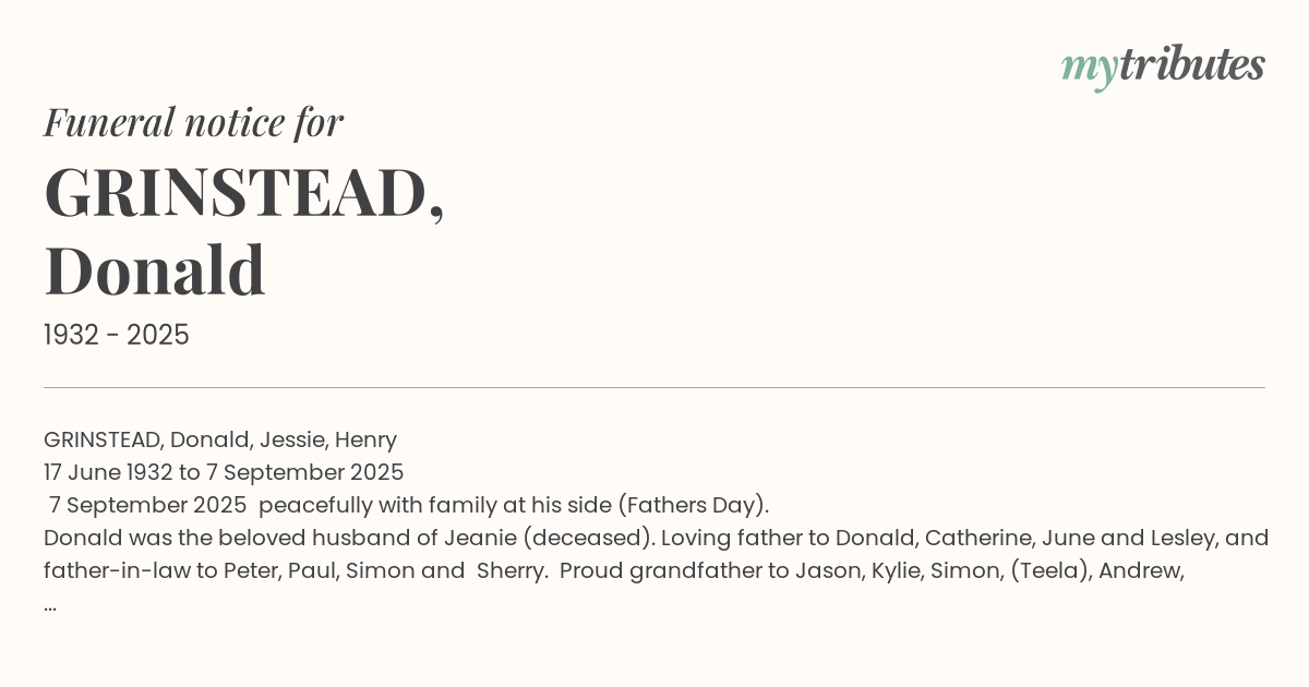 Donald was the beloved husband of Jeanie (deceased). Loving father to Donald, Catherine, June and Lesley, and father-in-law to Peter, Paul, Simon and Sherry. Proud grandfather to Jason, Kylie, Simon, (Teela), Andrew, (Tlisa), Daryl, Natalie (Tony), Stacey (Zac), Jonathon, Jamie and Patrick. Great-grandfather to Zane, Elija, Ella, Jake, Summer, Riley, Taj and Mia.