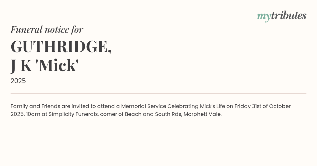 18°CFamily and Friends are invited to attend a Memorial Service Celebrating Mick's Life on Friday 31st of October 2025, 10am at Simplicity Funerals, corner of Beach and South Rds, Morphett Vale.