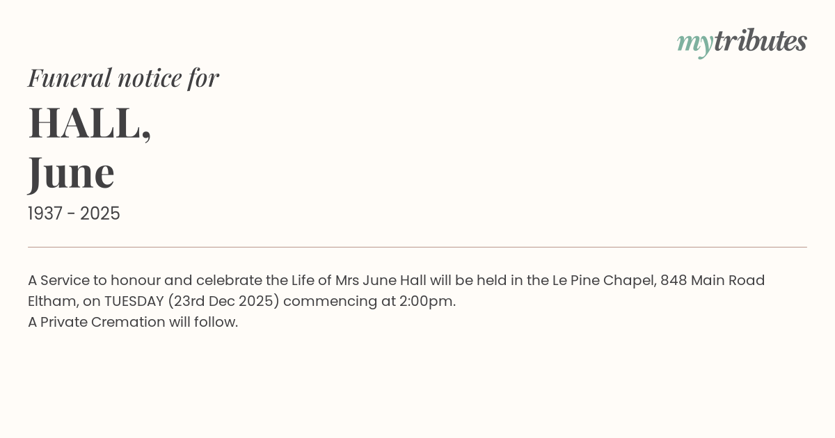 18°CA Service to honour and celebrate the Life of Mrs June Hall will be held in the Le Pine Chapel, 848 Main Road Eltham, on TUESDAY (23rd Dec 2025) commencing at 2:00pm.