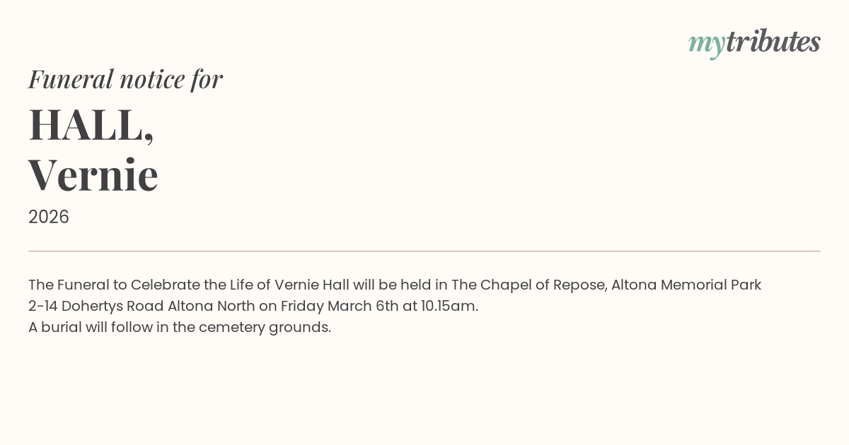 18°CThe Funeral to Celebrate the Life of Vernie Hall will be held in The Chapel of Repose, Altona Memorial Park 2-14 Doherty’s Road Altona North on Friday March 6th at 10.15am.