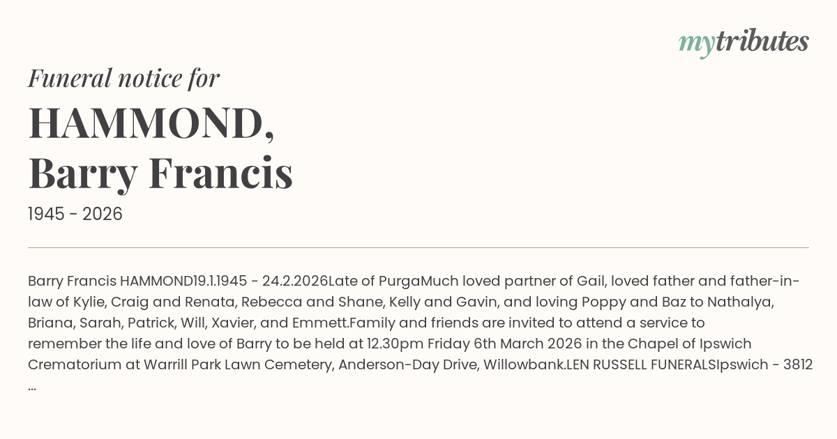 Family and friends are invited to attend a service to remember the life and love of Barry to be held at 12.30pm Friday 6th March 2026 in the Chapel of Ipswich Crematorium at Warrill Park Lawn Cemetery, Anderson-Day Drive, Willowbank.