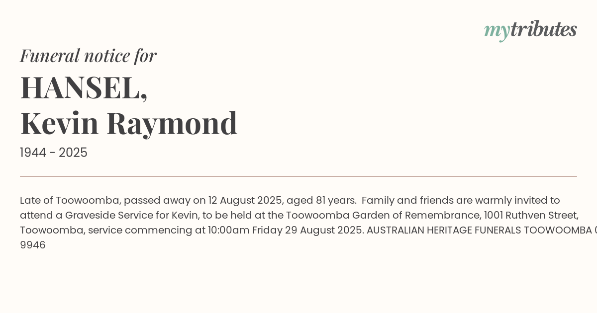 Family and friends are warmly invited to attend a Graveside Service for Kevin, to be held at the Toowoomba Garden of Remembrance, 1001 Ruthven Street, Toowoomba, service commencing at 10:00am Friday 29 August 2025.