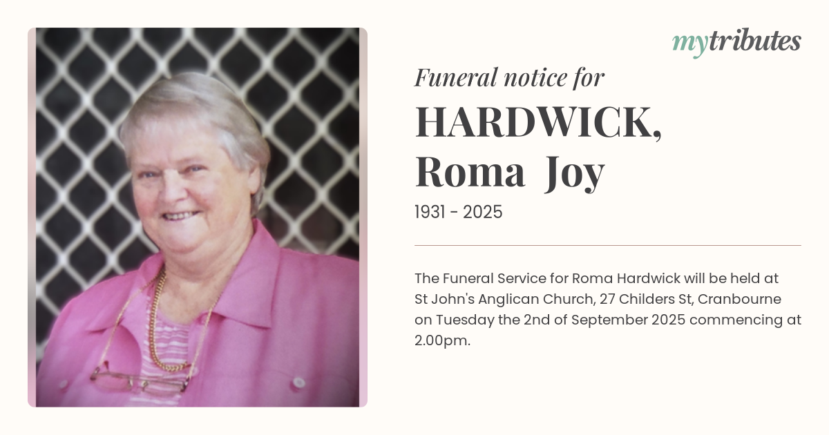 18°CThe Funeral Service for Roma Hardwick will be held at St John's Anglican Church, 27 Childers St, Cranbourne on Tuesday the 2nd of September 2025 commencing at 2.00pm.