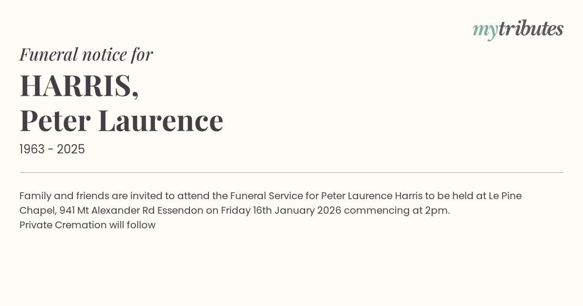 18°CFamily and friends are invited to attend the Funeral Service for Peter Laurence Harris to be held at Le Pine Chapel, 941 Mt Alexander Rd Essendon on Friday 16th January 2026 commencing at 2pm.