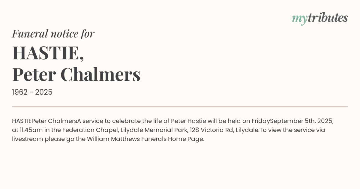A service to celebrate the life of Peter Hastie will be held on Friday
