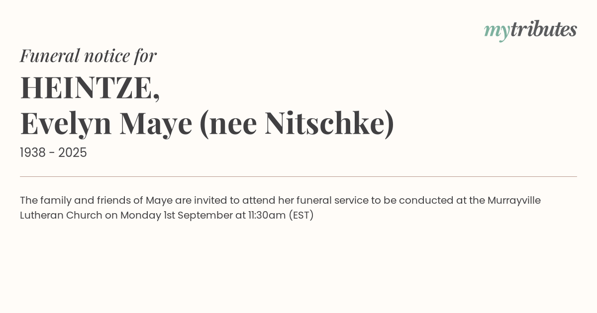 18°CThe family and friends of Maye are invited to attend her funeral service to be conducted at the Murrayville Lutheran Church on Monday 1st September at 11:30am (EST)