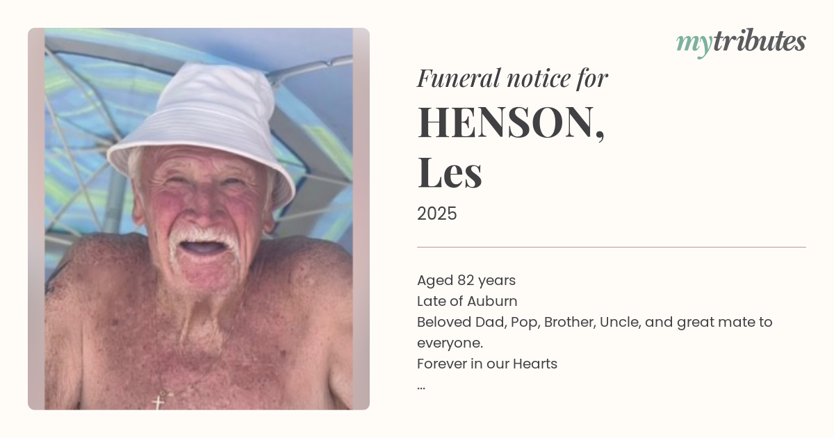 Family and friends of Les are warmly invited to attend his funeral service in the West Chapel, Pinegrove Memorial Park, Minchinbury, on Monday, 14 July 2025 at 1.30 pm.