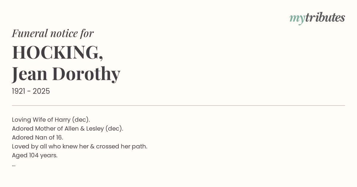 The Family & Friends of Jean are warmly invited to attend a Celebration of her life to be held in the West Chapel of Woronora Memorial Park, 121 Linden Street Sutherland, on Thursday 9th October commencing at 2.30pm.