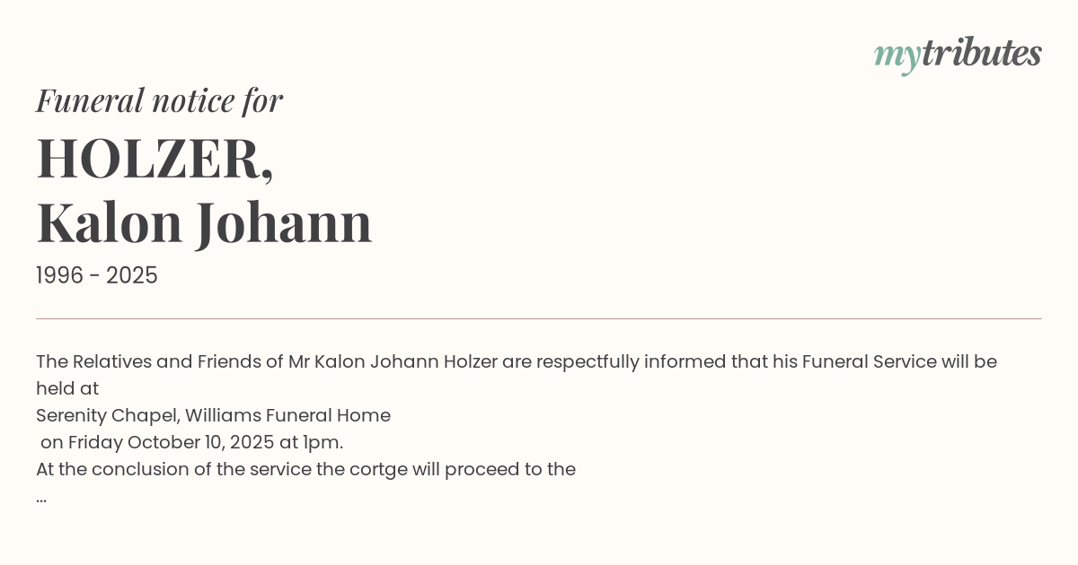 18°CThe Relatives and Friends of Mr Kalon Johann Holzer are respectfully informed that his Funeral Service will be held at