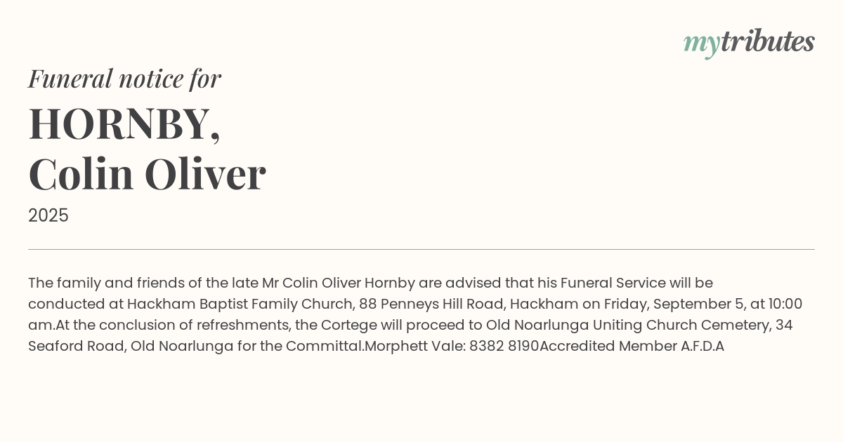 18°CThe family and friends of the late Mr Colin Oliver Hornby are advised that his Funeral Service will be conducted at Hackham Baptist Family Church, 88 Penneys Hill Road, Hackham on Friday, September 5, at 10:00 am.