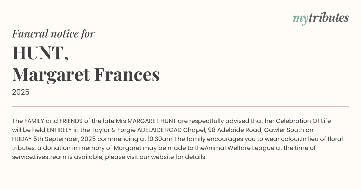 18°CThe FAMILY and FRIENDS of the late Mrs MARGARET HUNT are respectfully advised that her Celebration Of Life will be held ENTIRELY in the Taylor & Forgie ADELAIDE ROAD Chapel, 98 Adelaide Road, Gawler South on FRIDAY 5th September, 2025 commencing at 10.30am