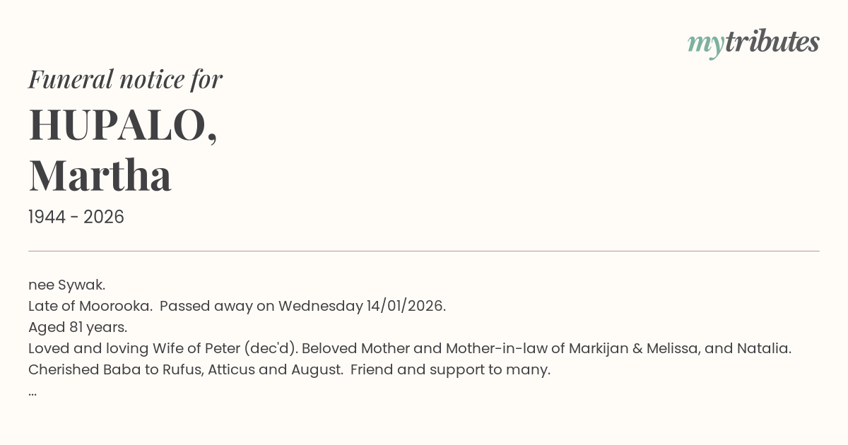 Relatives and friends are respectfully invited to attend Martha's funeral service to be held at Our Lady of Protection Ukrainian Catholic Church, 36 Broadway Street, Woolloongabba, followed by interment at Mt Gravatt Cemetery, 620 Mains Road, Nathan, on Friday 30/01/2026 commencing at 10:00am.