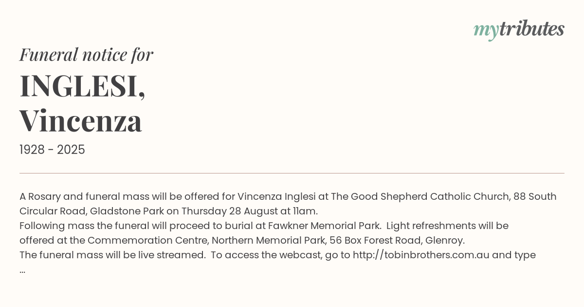 The funeral mass will be live streamed. To access the webcast, go to http://tobinbrothers.com.au and type Vincenza Inglesi in the search tab.
