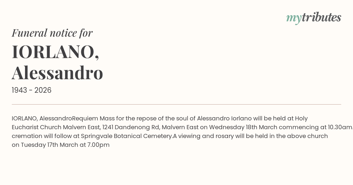 Requiem Mass for the repose of the soul of Alessandro Iorlano will be held at Holy Eucharist Church Malvern East, 1241 Dandenong Rd, Malvern East on Wednesday 18th March commencing at 10.30am.
