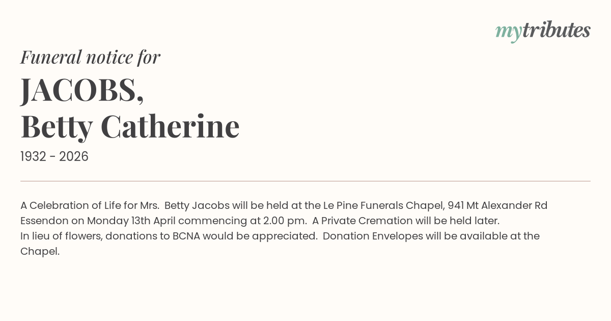 18°CA Celebration of Life for Mrs. Betty Jacobs will be held at the Le Pine Funerals Chapel, 941 Mt Alexander Rd Essendon on Monday 13th April commencing at 2.00 pm. A Private Cremation will be held later.