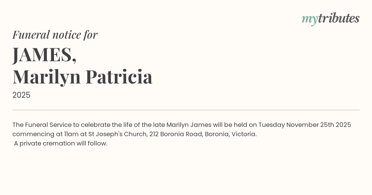 18°CThe Funeral Service to celebrate the life of the late Marilyn James will be held on Tuesday November 25th 2025 commencing at 11am at St Joseph's Church, 212 Boronia Road, Boronia, Victoria.