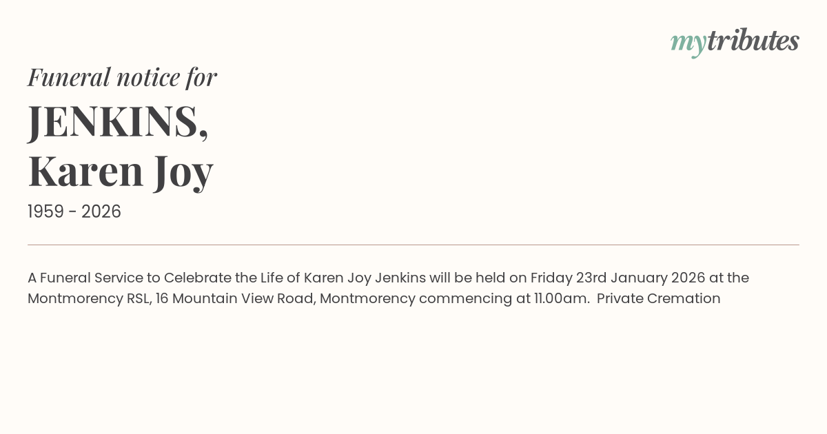 18°CA Funeral Service to Celebrate the Life of Karen Joy Jenkins will be held on Friday 23rd January 2026 at the Montmorency RSL, 16 Mountain View Road, Montmorency commencing at 11.00am. Private Cremation