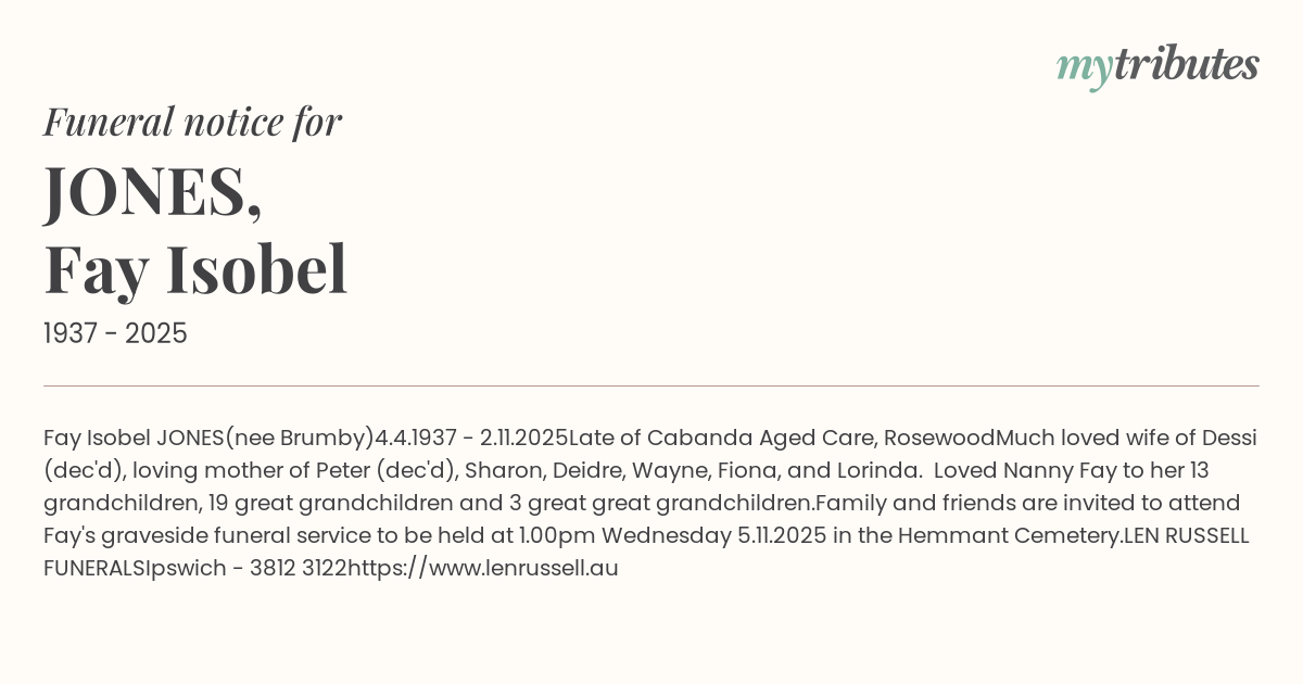 Family and friends are invited to attend Fay's graveside funeral service to be held at 1.00pm Wednesday 5.11.2025 in the Hemmant Cemetery.