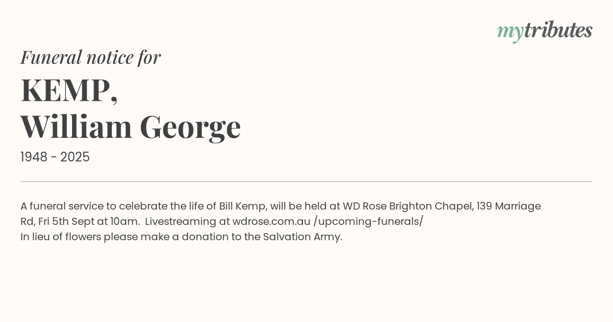 18°CA funeral service to celebrate the life of Bill Kemp, will be held at WD Rose Brighton Chapel, 139 Marriage Rd, Fri 5th Sept at 10am. Livestreaming at wdrose.com.au /upcoming-funerals/