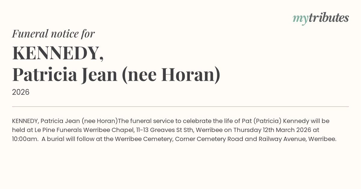 The funeral service to celebrate the life of Pat (Patricia) Kennedy will be held at Le Pine Funerals Werribee Chapel,