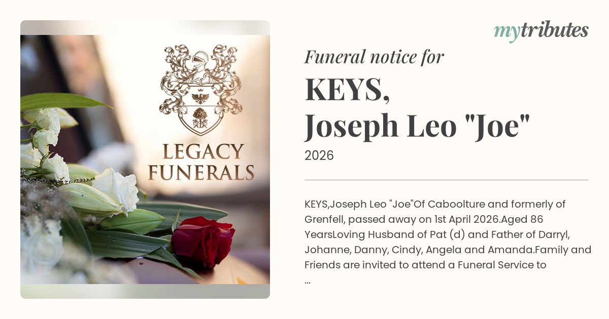 Family and Friends are invited to attend a Funeral Service to Celebrate Joe's Life to be held at St Laurence's Anglican Church, 165 King Street, Caboolture on Friday, 17th April, commencing at 11 am.