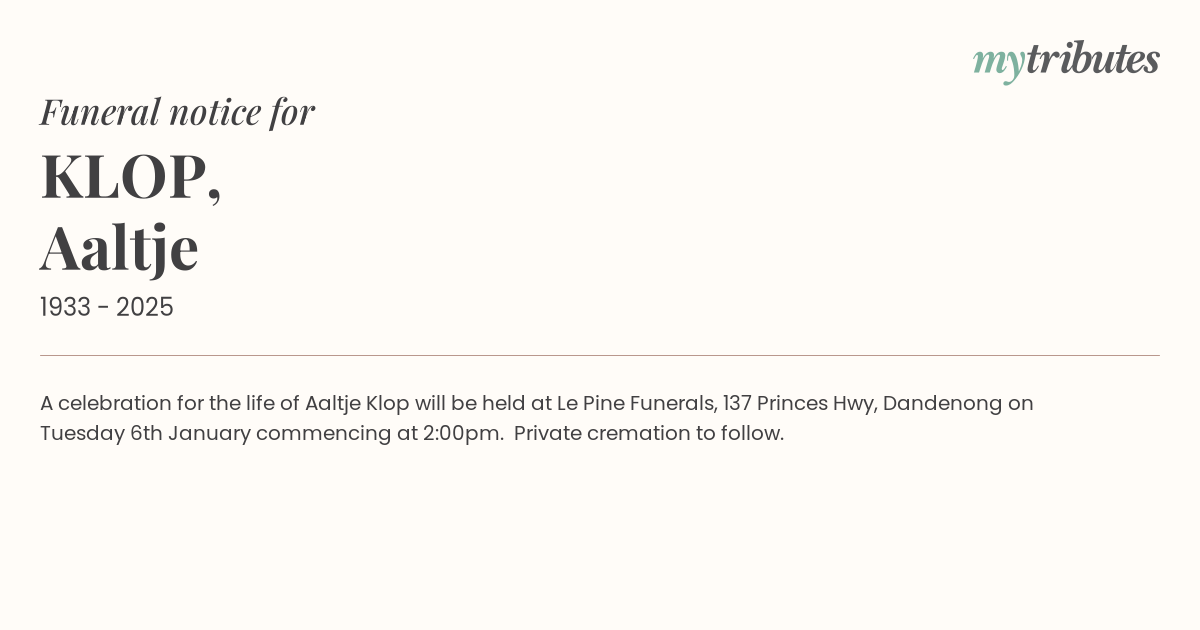 18°CA celebration for the life of Aaltje Klop will be held at Le Pine Funerals, 137 Princes Hwy, Dandenong on Tuesday 6th January commencing at 2:00pm. Private cremation to follow.