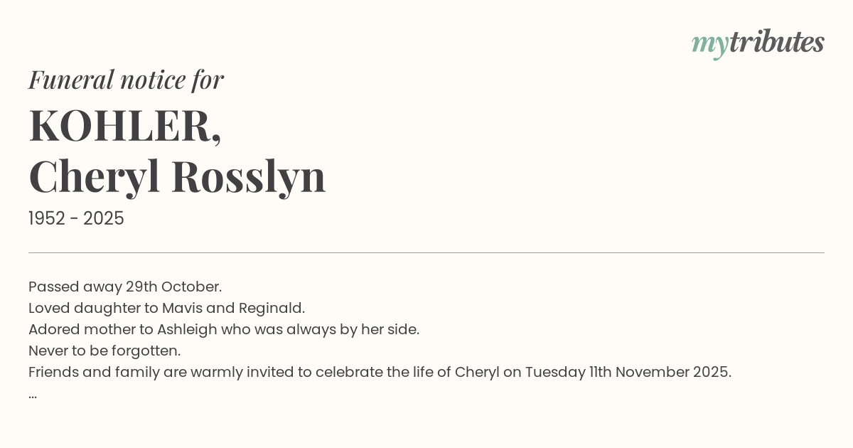 Friends and family are warmly invited to celebrate the life of Cheryl on Tuesday 11th November 2025.