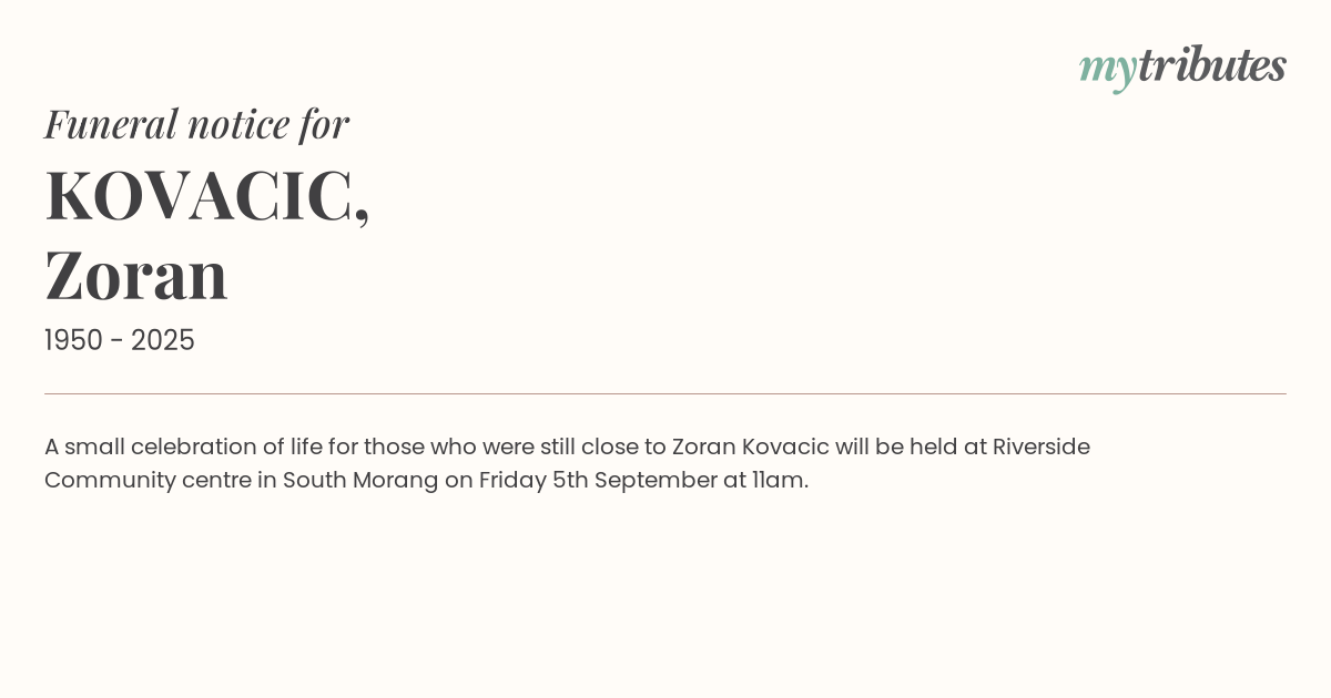 18°CA small celebration of life for those who were still close to Zoran Kovacic will be held at Riverside Community centre in South Morang on Friday 5th September at 11am.