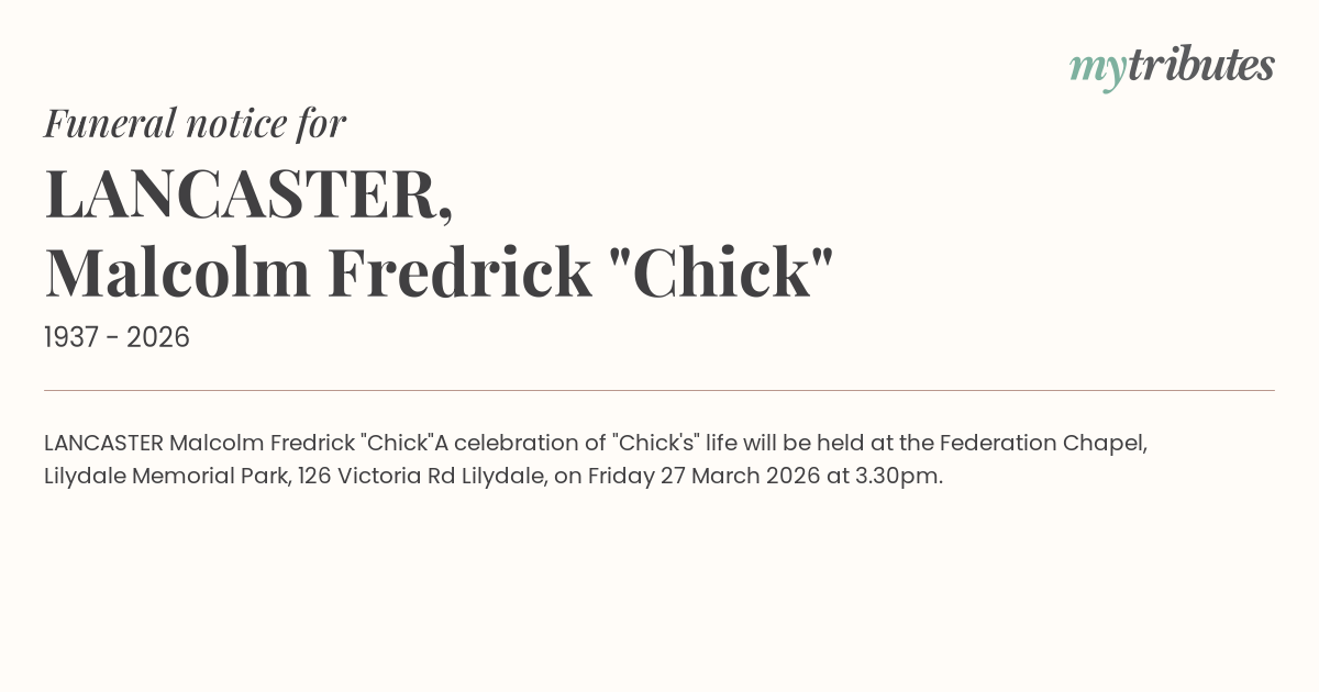 A celebration of "Chick's" life will be held at the Federation Chapel, Lilydale Memorial Park, 126 Victoria Rd Lilydale, on Friday 27 March 2026 at 3.30pm.
